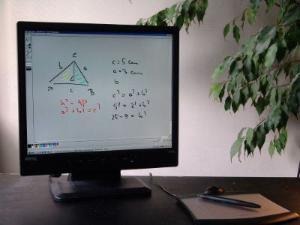Bei meiner online Nachhilfe sehen wir auf den Bildschirmen der verbundenen Computer sofort, was der andere und man selbst gerade macht. Geschrieben und Gezeichnet wird mit einem digitalen Stift auf einem Tableau (im Bild rechts unten). Korrekturen und Ergänzungen werden über das Headset (oder ein Ansteckmikrofon) "live" besprochen